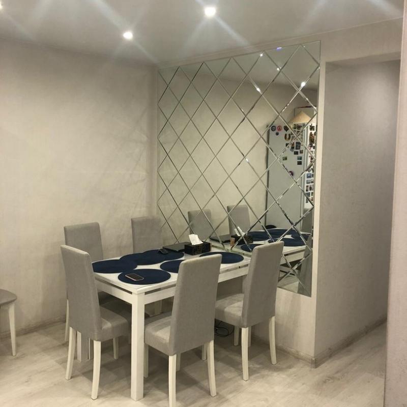 Использована серебристая квадратная зеркальная плитка размером 18х18.