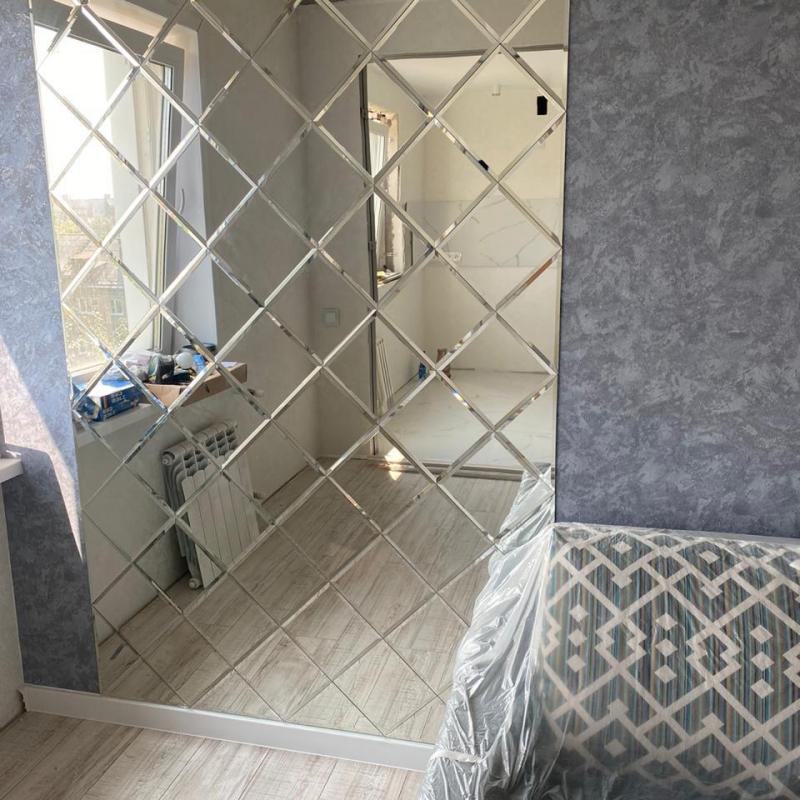 Для украшения использовалась зеркальная плитка формы вытянутый ромб серебряного цвета.
